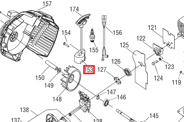 Компресія відмінна, паливо є, іскра в нормі, а не заводиться — значить, проблеми з запалюванням (кут випередження запалювання). Але момент запалювання на бензокосах не регулюється! Тому розбираємо агрегат — відводимо двигун від валу зі стартером. Відкривається магнето — котушка з двома висновками-контактами і з двома «щоками» сердечника, які в якийсь момент замикаються магнітом, вбудованим в маховик за який чіпляється стартер при прокручуванні. Виявилося, що це замикання (його видно — це поєднання обох кінців сердечника магнето з такими добре виділеними майданчиками магніту в маховику, зазор там частки міліметра, в той час як в інших положеннях маховика над магнето залишається по кілька міліметрів) далеко не збігається з верхньої мертвої точки поршня (цю точку можна знайти, провертаючи вал, спостерігаючи за поршнем в отвір, в якому вивернута свічка). Ось і поломка!
